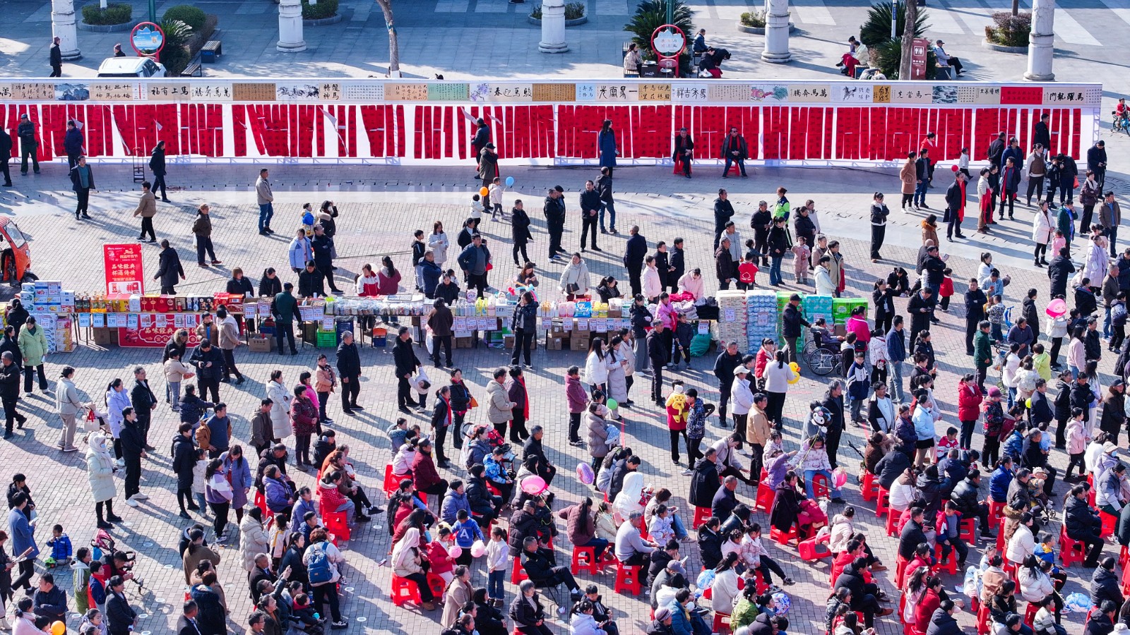 活动现场,诗朗诵《这就是竹山》、书画+太极《骏马春风意墨舞竹山春》、诗词情景剧《木兰辞》等特色节目轮番上演,将经典诗词与竹山人文底蕴深度融合;“飞花令”“诗词接龙”等互动环节趣味盎然,吸引群众踊跃参与;县书画家协会会员现场写送春联、创作书画长卷,以墨香传递新春祝福;广场两侧,2026年年货节摊位上同样热闹非凡,寿康永乐超市的日常百货与17个乡镇的农特产品集中展销,吸引众多市民围观选购。