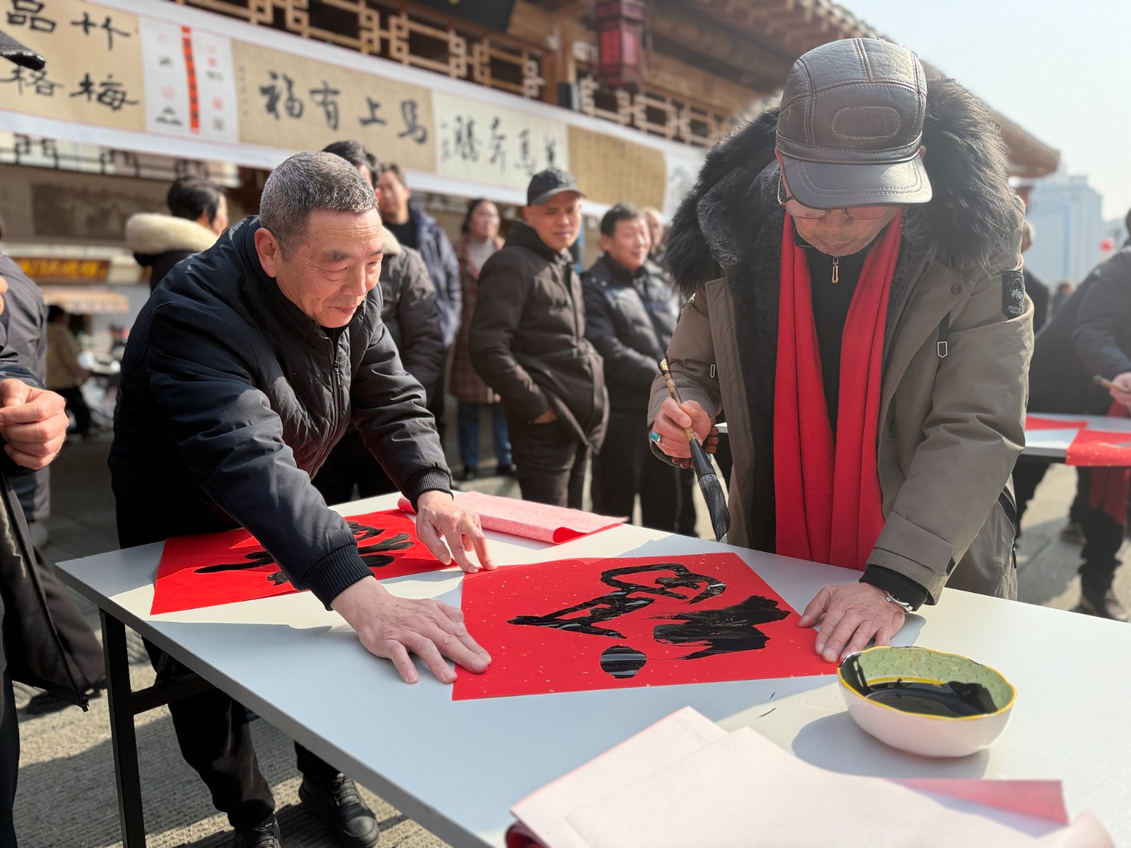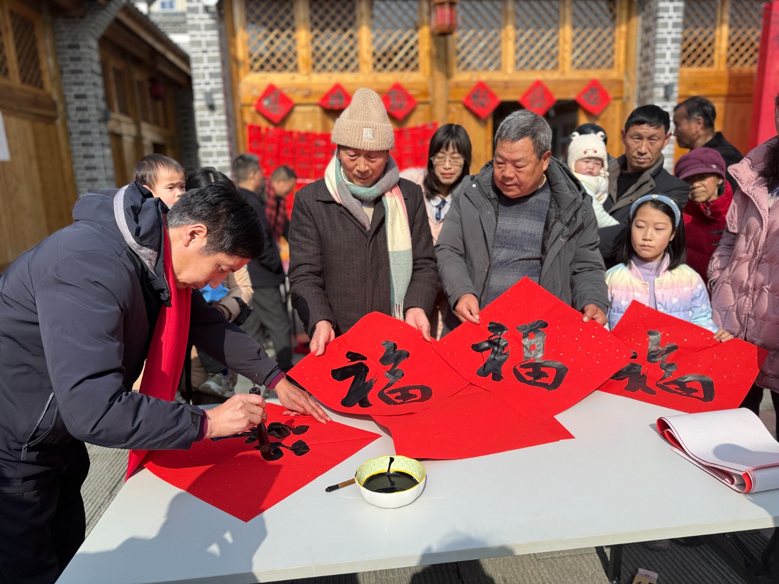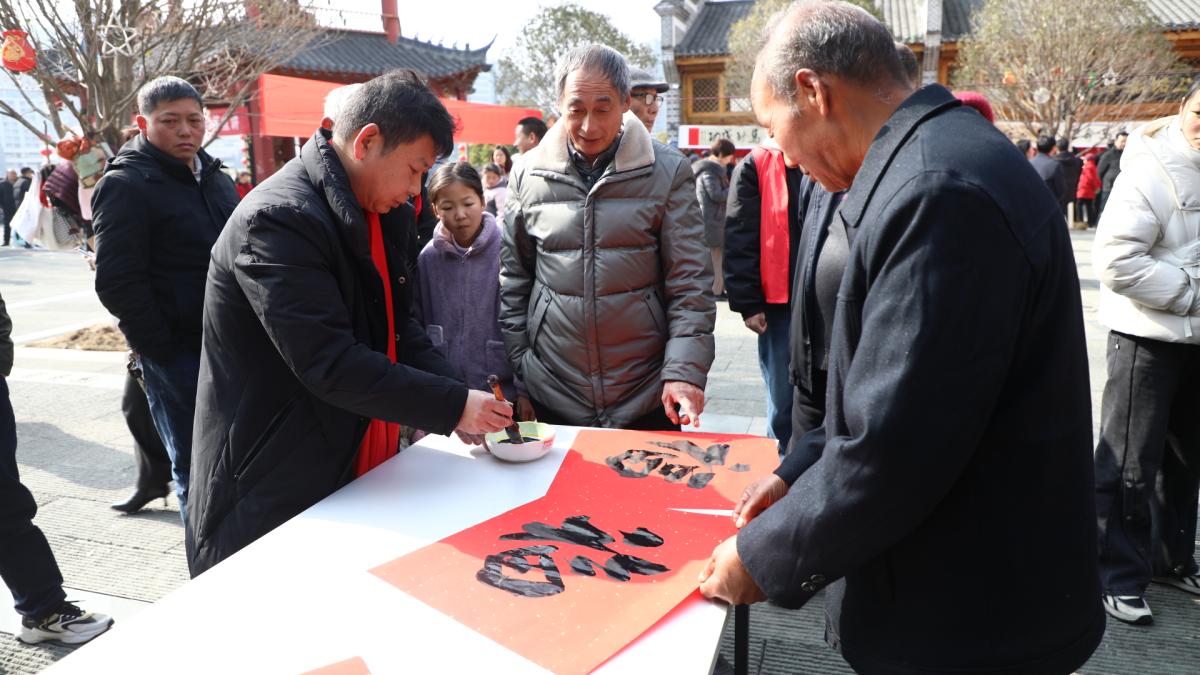 活动现场,县书画家协会、诗词楹联学会的会员与志愿者们凝神挥毫,浓墨落纸,一幅幅寓意吉祥的春联、一个个遒劲喜庆的“福”字接连成型。志愿者们在一旁默契配合,研墨铺纸、整理作品,忙得不亦乐乎。现场市民人头攒动,大家围站案前,或驻足观摩创作、轻声品评笔墨韵味,或有序等候领取心仪的春联福字,欢声笑语不断,红幅墨香交织,新春喜庆氛围格外浓厚。
