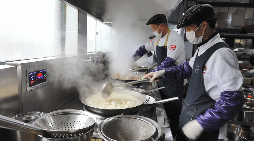 在桃花源街区的合碗席店内,大厅悬挂的巨幅团年饭宣传海报格外醒目。后厨里,员工们正有序进行各项准备工作,清洗、切配、备料,忙碌却秩序井然。