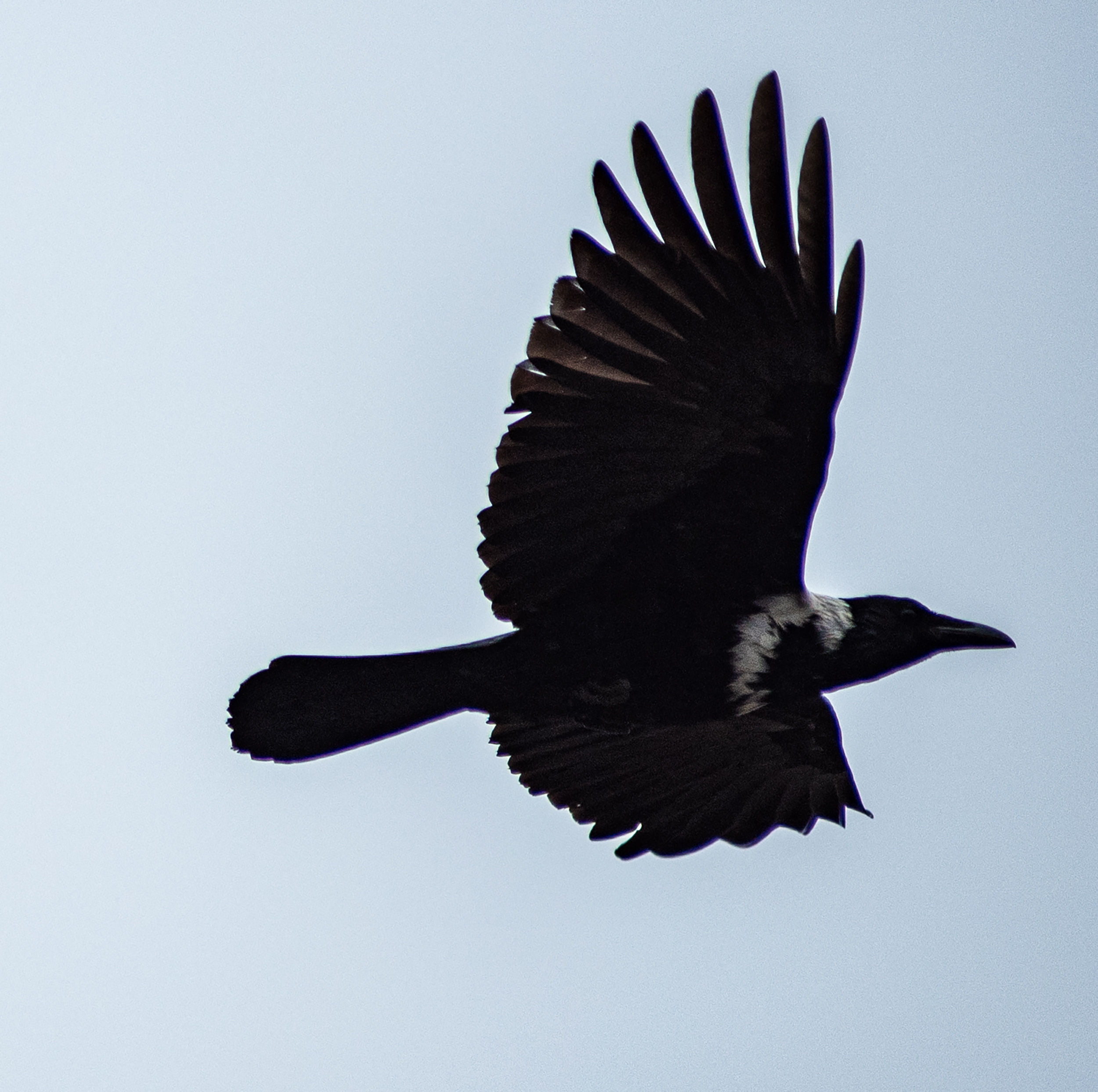 连日来这两对白颈鸦每日清晨与傍晚准时在湖面周边活动,时而停留在岸边、渡口船舷上、时而低头觅食,时而低空盘旋飞行,状态十分稳定。白颈鸦通体以黑色为主,仅颈后、上背、颈侧及前胸环绕一圈白色羽毛,形成鲜明颈圈,辨识度极高。该鸟类属雀形目鸦科,体长约48厘米,多栖息于平原、河滩、村镇周边,常单独或成对活动,极少集群,主要以植物种子、昆虫等为食。
