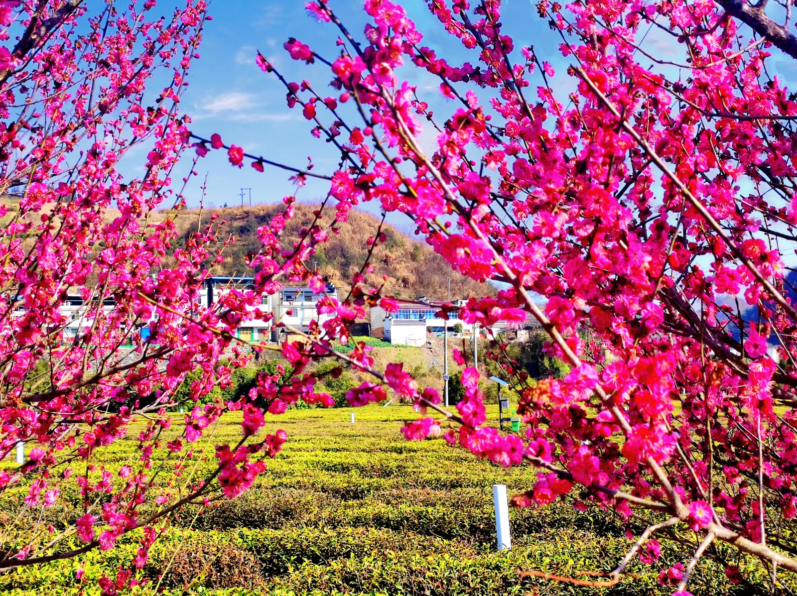 今日竹山网消息 近日,竹坪乡宽坪村200余亩茶园里,寒梅绽艳,茶垄凝翠,一红一绿相映成趣,勾勒出清雅动人的生态画卷。