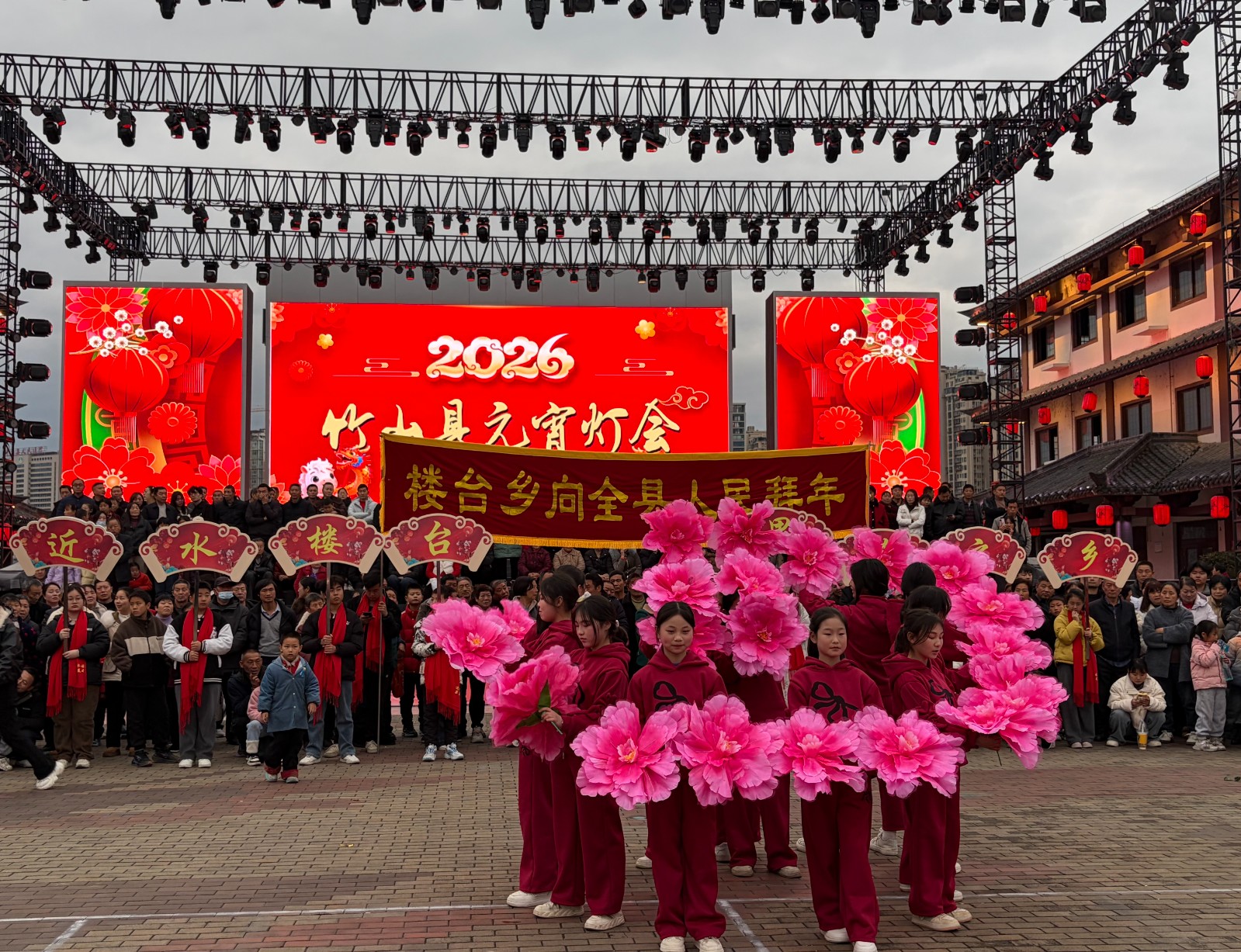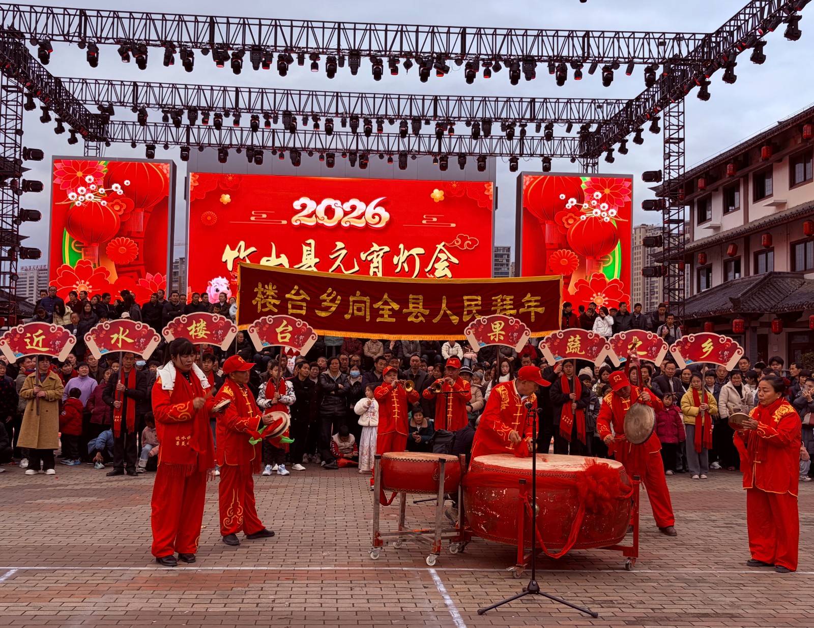 今日竹山网消息 3月2日,农历正月十四,桃花源广场上人声鼎沸、锣鼓喧天,2026年元宵节民俗文艺展演活动在此隆重举行。来自全县八个乡镇的文艺队伍轮番登台,为现场观众献上了一场充满乡土气息与节日氛围的文化盛宴。其中,楼台乡由三台村、楼台村、塔院村的群众组成的演出队伍脸上洋溢着自信的笑容,点燃了现场的气氛。