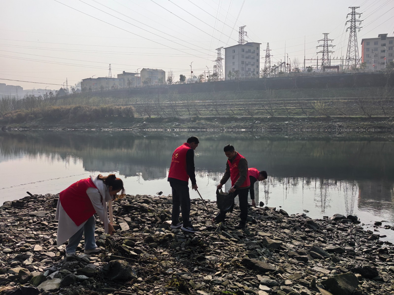 活动中,“不老松”志愿服务队队员们身着红马甲,沿河岸开展地毯式清洁行动。大家重点捡拾塑料瓶、泡沫箱、包装袋等白色垃圾,细致清理河道漂浮物,对可回收物分类分装、对有害垃圾规范标记,做到河段清理无死角、零遗漏,用实际行动擦亮河道“颜值”。
