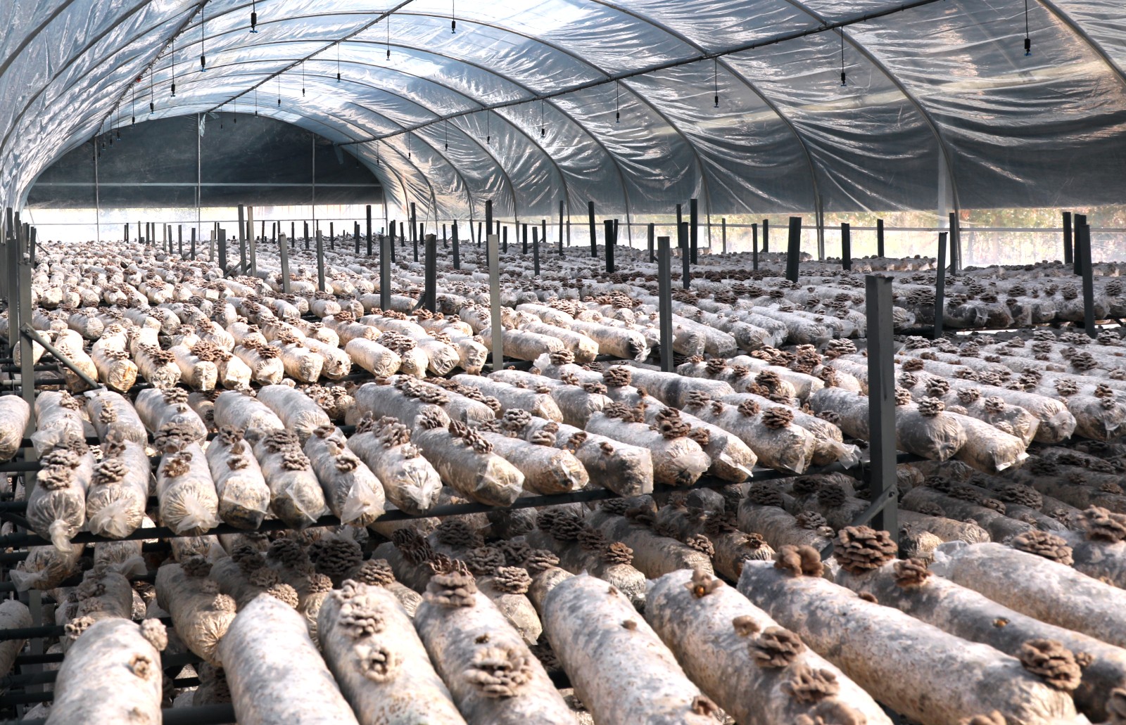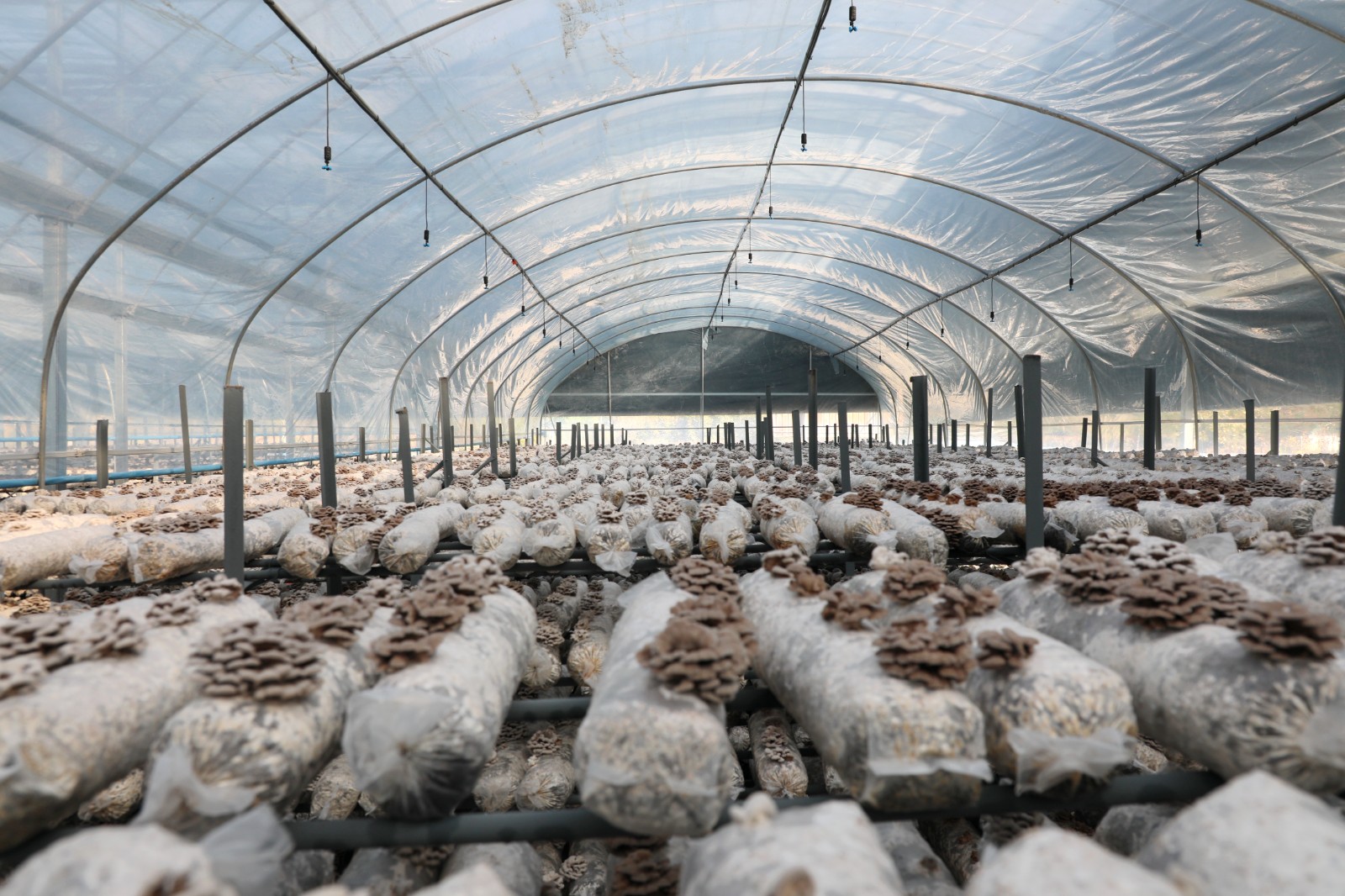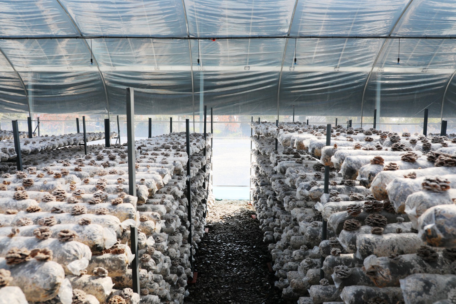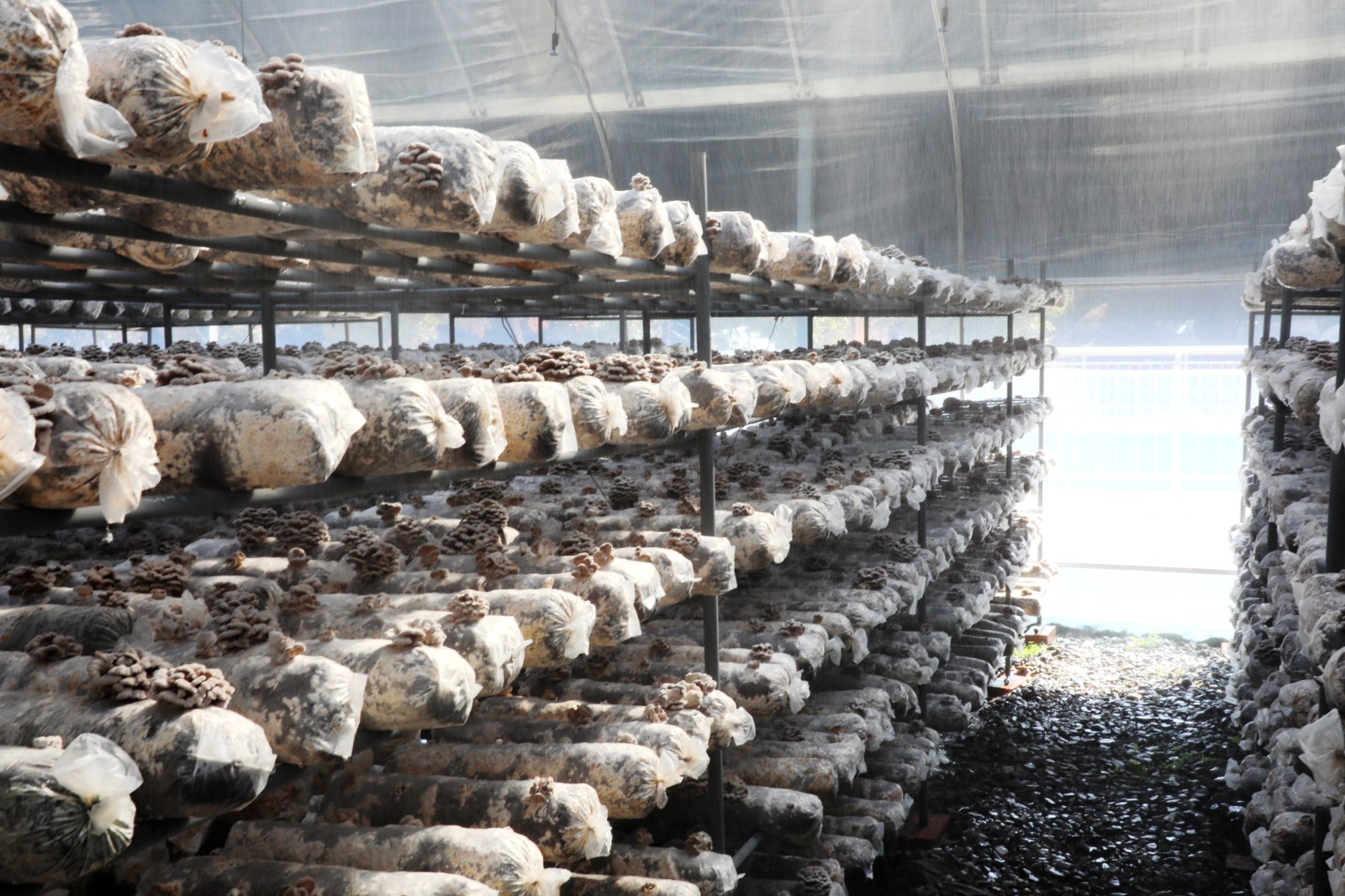 今日竹山网消息 3月9日,笔者走进位于潘口乡龙王沟村的湖北民心生态农业科技有限公司(简称“民心公司”)食用菌大棚,只见一排排整齐的菇架上摆满了菌棒,菌棒上长满了一种酷似白色花朵的菌子。大棚的上方吊着排列整齐的喷头,通过微喷灌设施喷出细密的水雾,菌子在水雾滋润下正竞相生长,看起来既美观,又让人感到震撼。