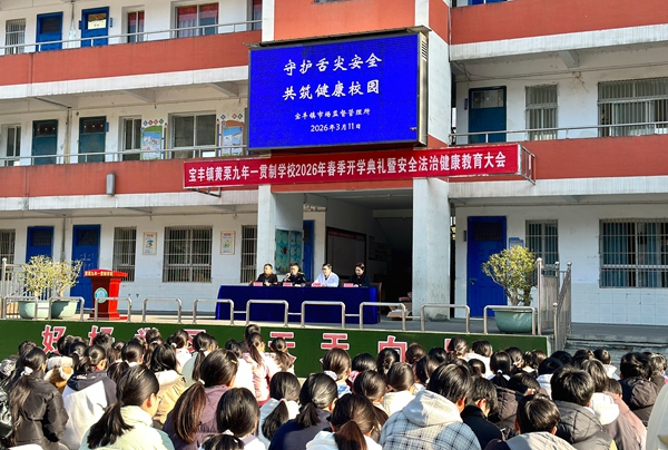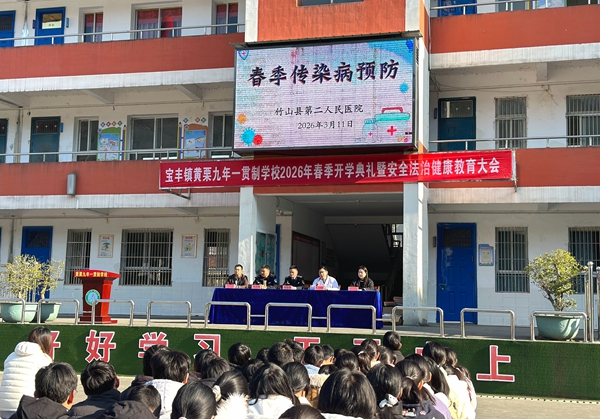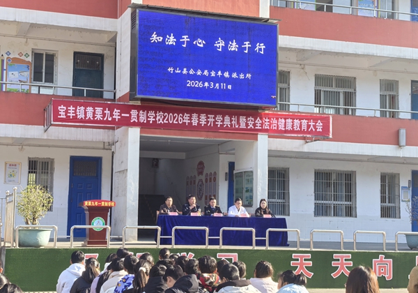 今日竹山网消息 3月11日,宝丰镇黄栗九年一贯制学校举行2026年春季学期开学典礼。本次典礼创新构建“安全+成长”育人课堂,特邀派出所民警、市场监管所工作人员及竹山县第二人民医院公共卫生科医务人员组成“校园安全讲师团”,为师生带来一堂生动实用的“开学第一课”。