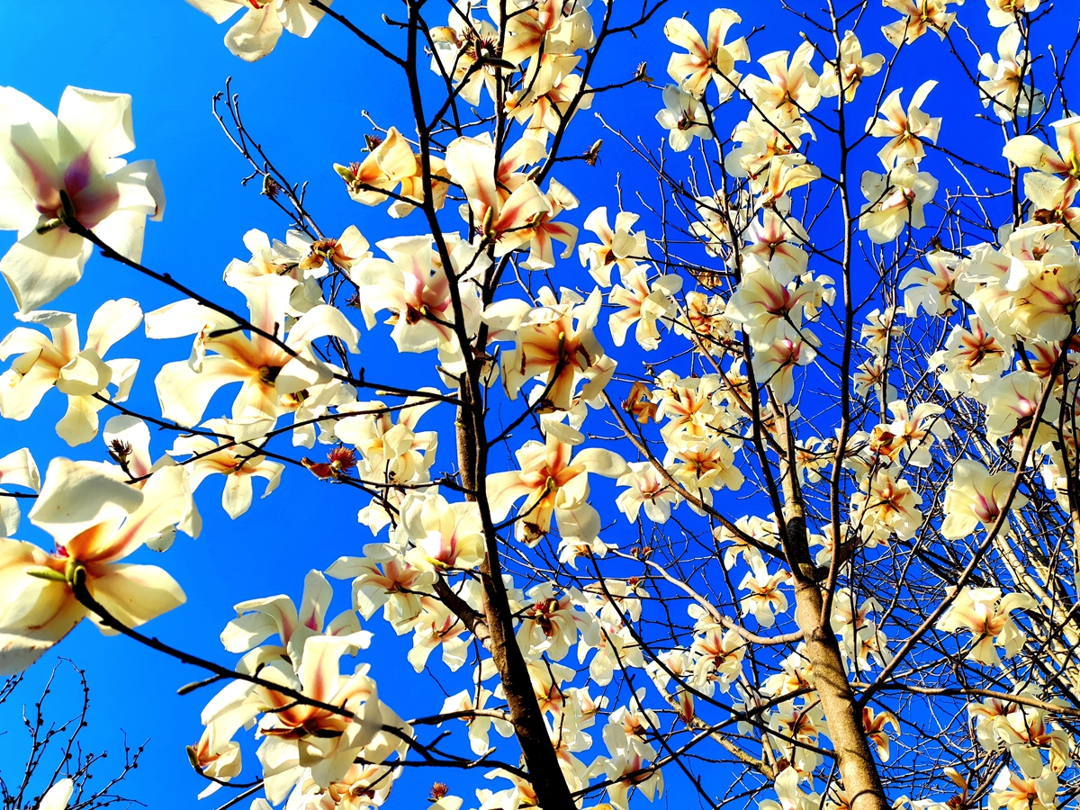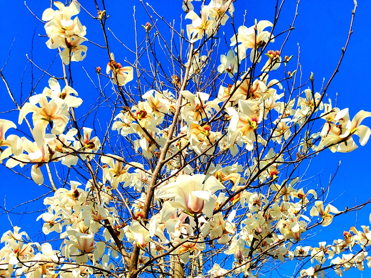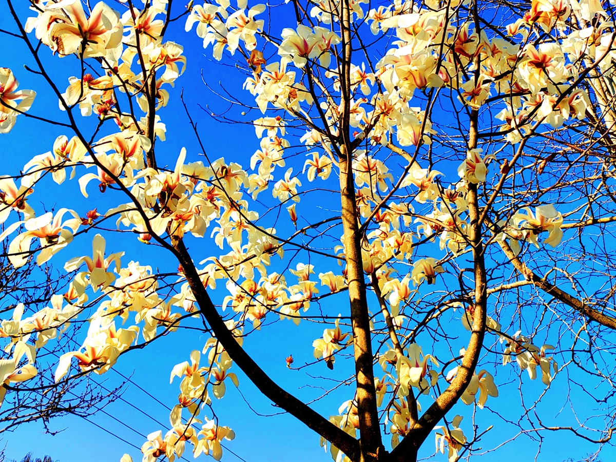 阳光漫洒,花瓣泛着温润光泽,半透明的质地更显轻盈。风过处,花枝轻摇,暗香浮动,疏影横斜间,与湛蓝苍穹相映成趣。花的柔媚与天的旷远相融,刚柔相济,美得干净、热烈,又自带一份遗世独立的清贵,将春日的浪漫与诗意,写满整片晴空。(张云朝)