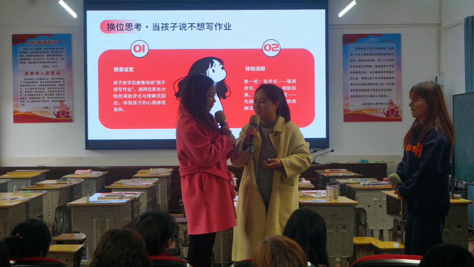 讲座以富有趣味的互动小游戏拉开序幕,迅速拉近了家校距离。在核心的“换位思考”环节,家长们受邀走上讲台,亲身扮演孩子的角色,通过情景模拟切身体验孩子的情绪变化与内心感受。这种沉浸式的互动让家长们深受触动,纷纷表示更理解了孩子行为背后的心理需求。