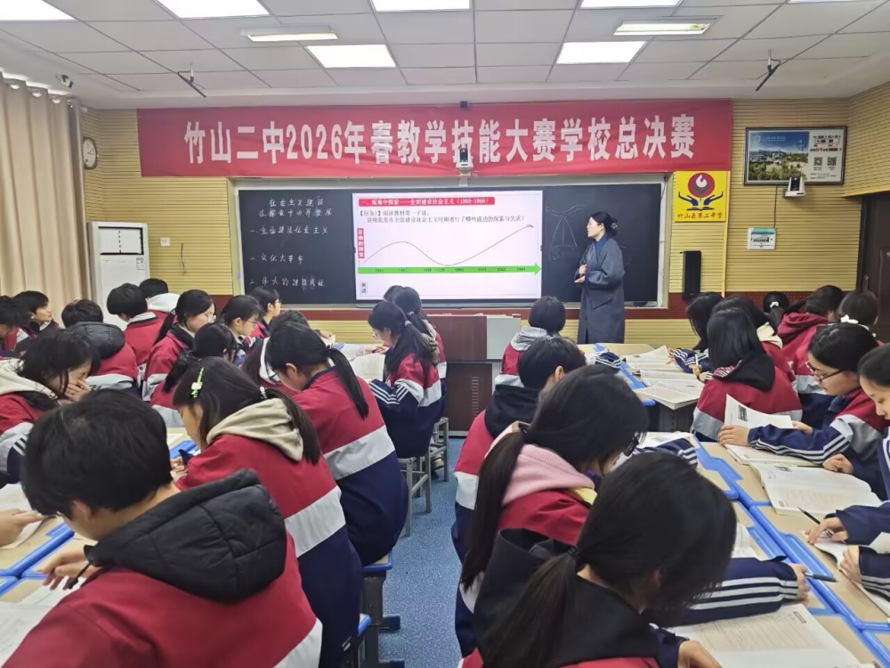今日竹山网消息 3月17日至18日,竹山二中2026年春季“和谐课堂”教学技能大赛总决赛在综合楼录播室举行,来自文科组和理科组的13位教师同台竞技,呈现了一场精彩纷呈的教学盛宴。