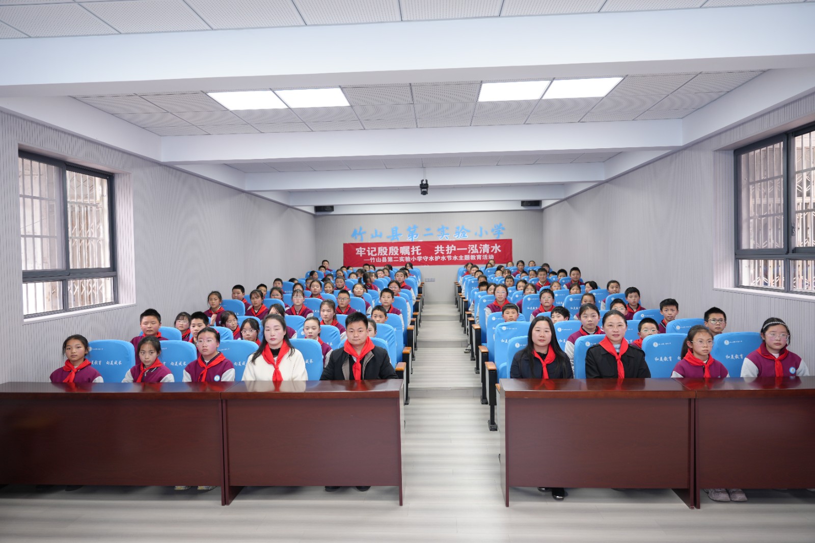 活动在嘹亮的中国少年先锋队队歌声中拉开帷幕。在两地“红领巾讲解员”分享环节,县第二实验小学队员代表讲述了袁孝文守护绿水青山的感人故事,展现了基层守护者的坚守与奉献;邯郸市丛台区曙光小学带来《争当护水小先锋 共守北上清流》主题宣讲,从当地饮水变化到身边节水行动,传递出受水区少年的感恩之心与责任担当。最后,两地少先队员在领誓人的带领下共同起立,宣读《守水护水节水倡议书》,立志以红领巾的赤诚守护水资源生命线,以少年担当共筑生态梦想,带动家庭、影响邻里,让守水护水蔚然成风。