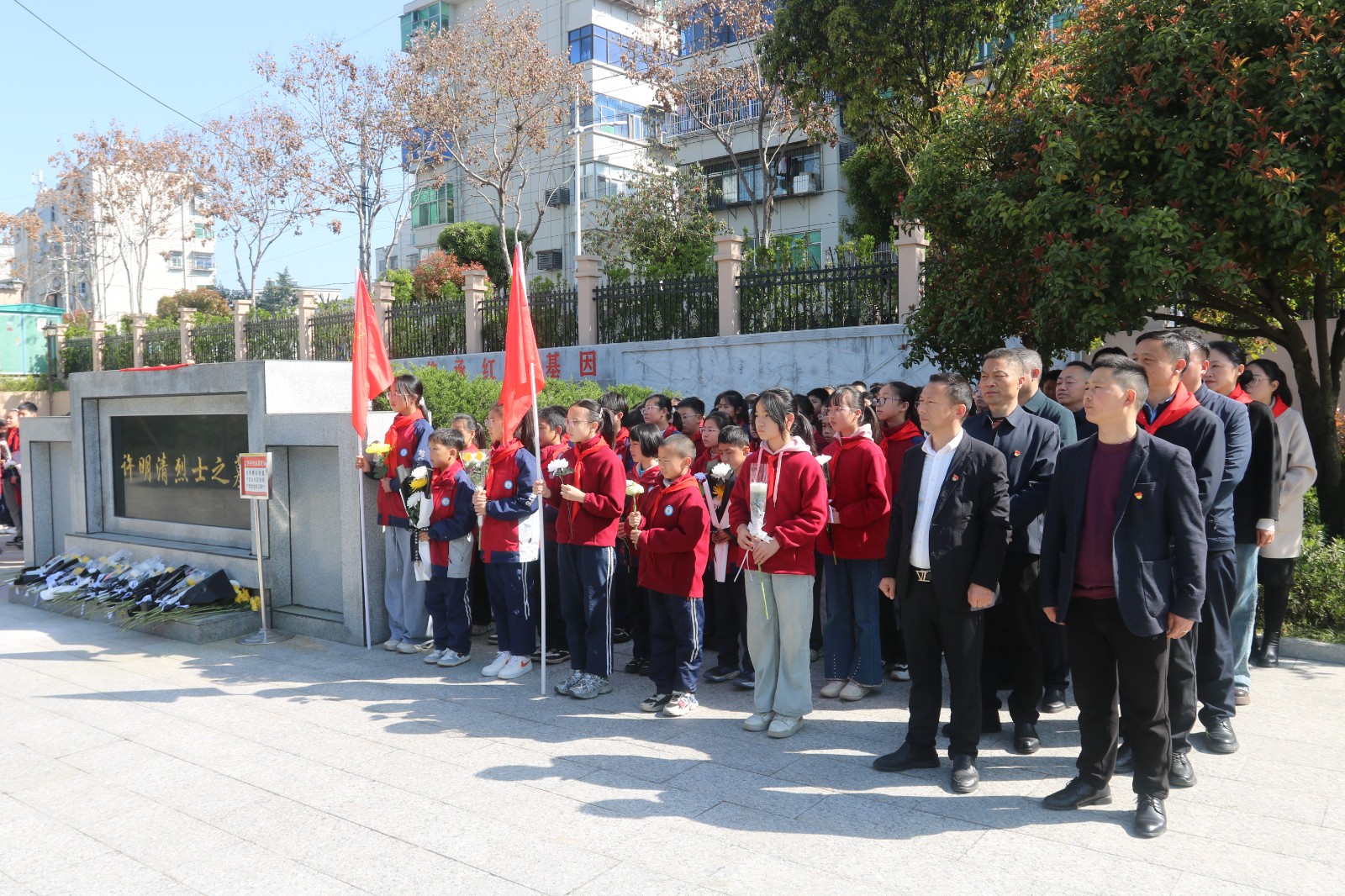 “我是中国少年先锋队队员……准备着,为共产主义事业贡献力量!”全体少先队员高举右拳、重温入队誓词,铮铮誓言响彻陵园上空,彰显少年儿童坚定的理想信念与报国初心;党员教师同步重温入党誓词,坚守初心使命、践行育人担当。活动最后,全体师生有序瞻仰许明清烈士纪念碑,绕行一周,郑重献上亲手制作的小白花,表达对先烈的深切缅怀。