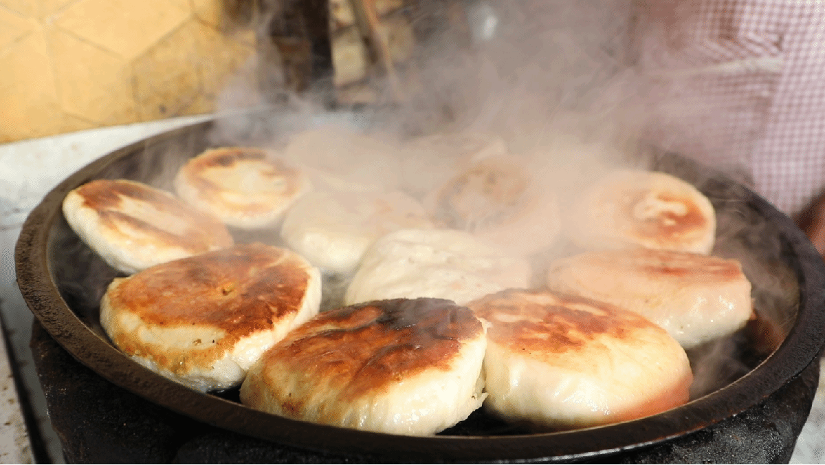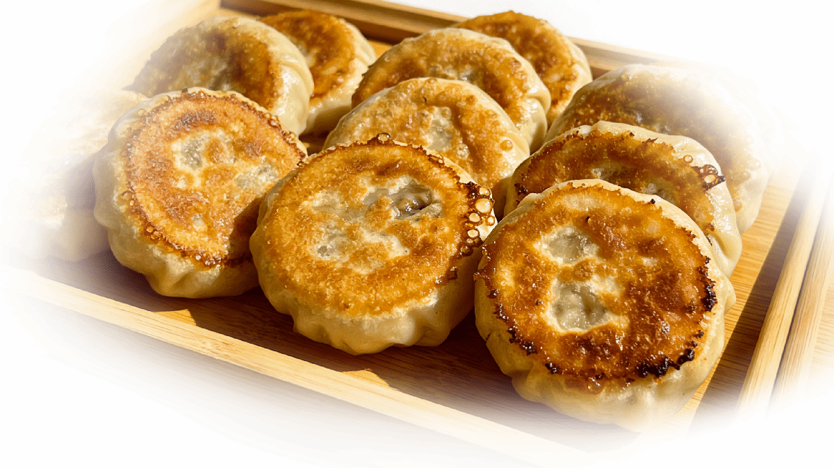 叶绍琴将提前包好的水煎包整齐摆放进温热的平底锅,小火煎至底部定型后,缓缓加入清水并迅速盖锅进行焖煮。三分钟左右,待锅内水分即将蒸干,再沿锅边均匀淋入少量菜籽油,转中火煎至底皮呈诱人的金黄色,一锅热气腾腾的水煎包就可以出锅了。