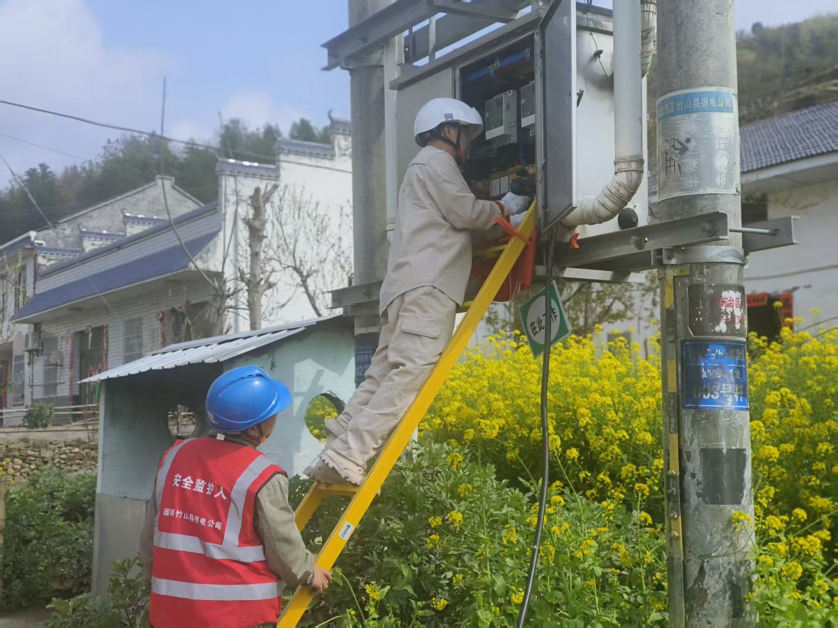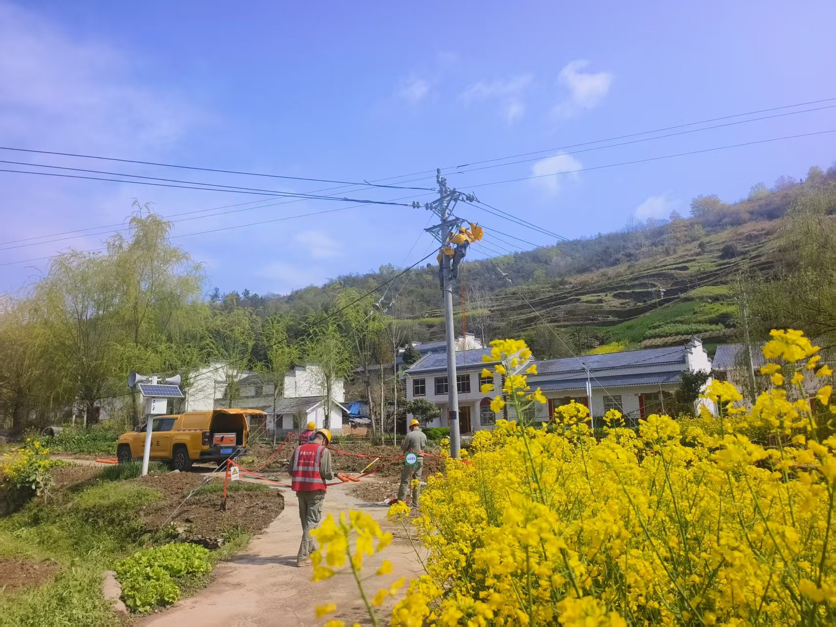 今日竹山网消息 3月31日,宝丰镇东河村油菜花田旁,县供电公司带电作业班与宝丰供电所员工协同作战,对10千伏宝55黄栗线东河支线开展升级改造。现场采用“带电作业+低压发电机保电”模式,在不影响村民正常用电的前提下完成施工,实现“零停电”作业。