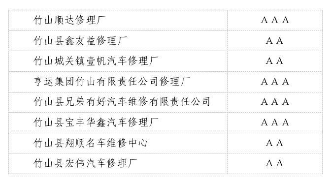 竹山县机动车维修行业质量信誉考核结果公示名单