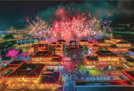 圣水湖畔的“千绣花海”正值盛放。万株月季与芍药泼洒成巨幅锦缎,“十二花神”提着花篮巡游,非遗传承人舞动《上庸滚龙》,布龙在花浪间翻腾如活物。孩子们乘网红小火车穿行花径,太空舱民宿的玻璃穹顶倒映着整片星空一-这座以“四季有花”为魂的小镇,把赏花经济玩出了新高度:研学基地教孩子压花制茶,路亚舟钓赛事在湖面划出银弧,连直升机都成了俯瞰花海的观景台。