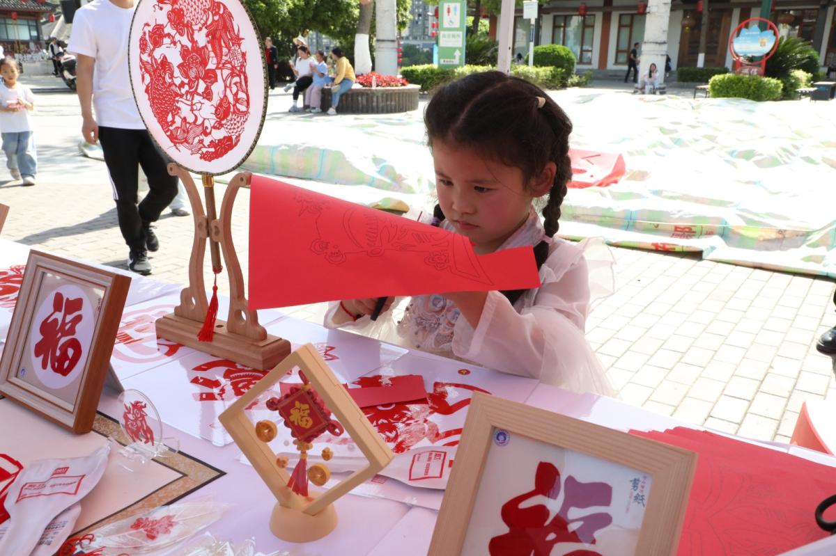 此外,本土作品展区集中展示《堵河》《女娲传说》等竹山籍作者创作的书籍,彰显本土文化独特魅力;非遗文创展区则将堵河剪纸与“护苗”行动相结合,现场创作并发放非遗绿书签,让非遗文化与阅读理念深度融合。