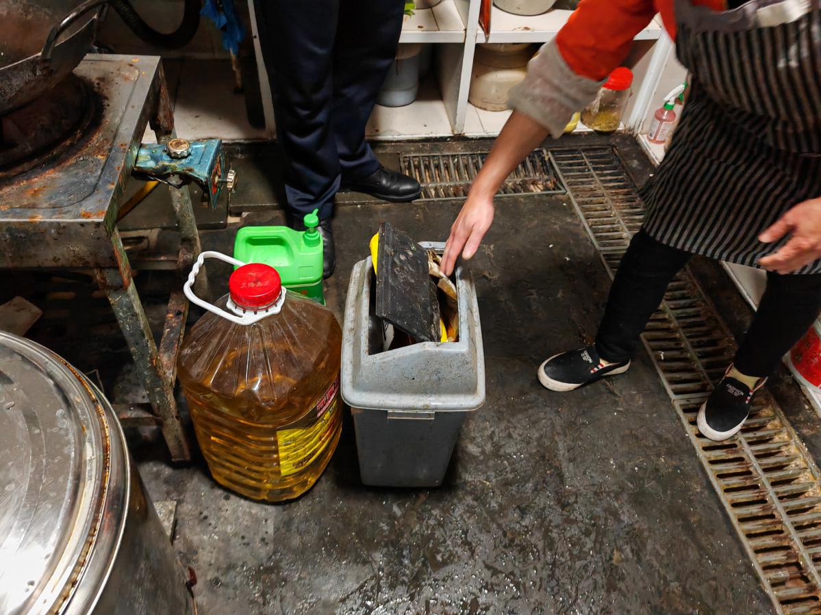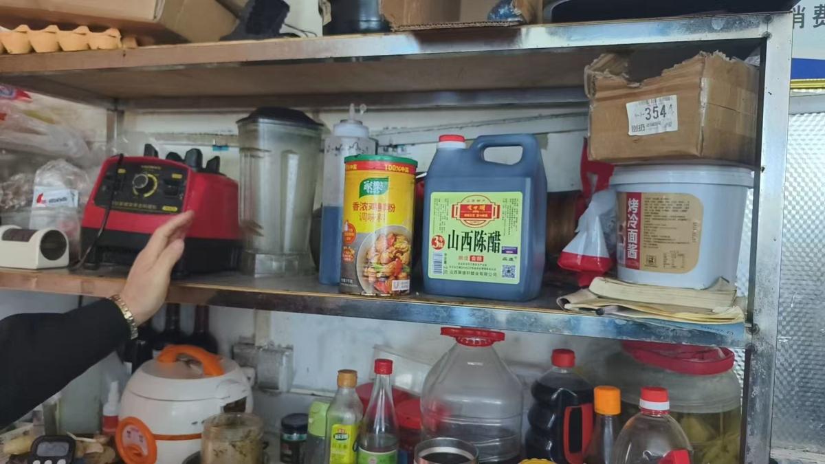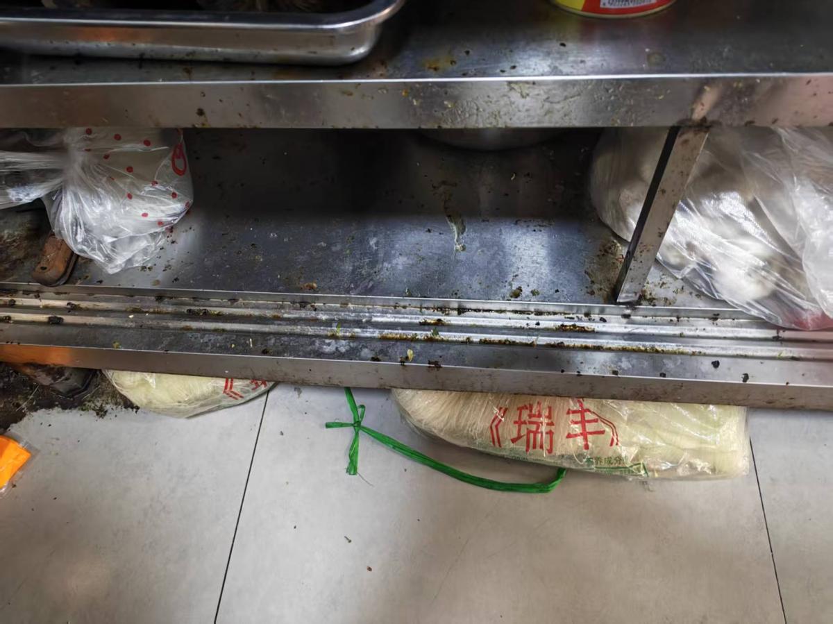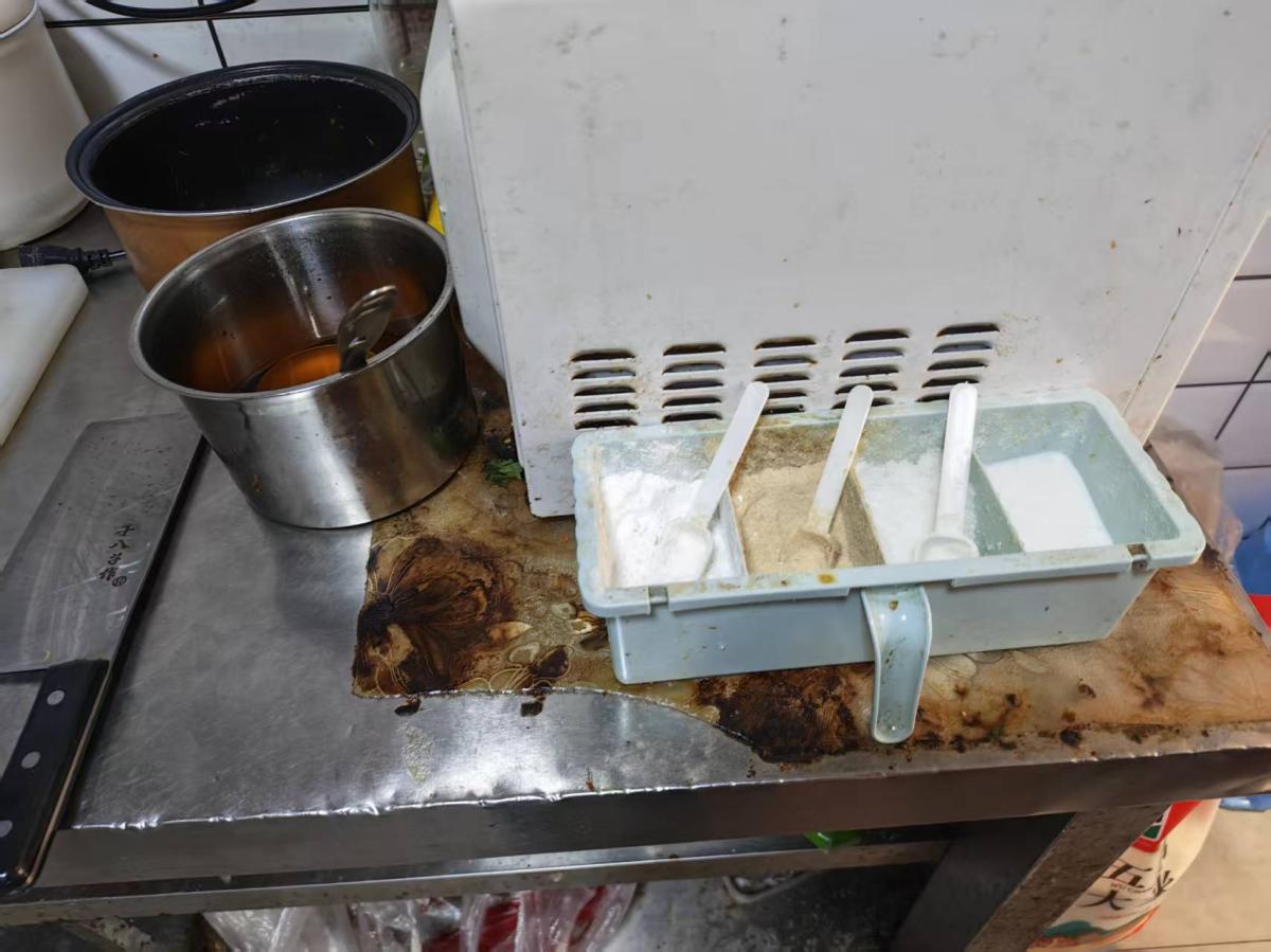 上榜理由:食品加工台面及操作台食品贮存柜油污严重,面制品直接置入地面;食品原料储藏间食品与非食品混放且摆放杂乱,个人生活用品摆放在食品原料储藏间。
