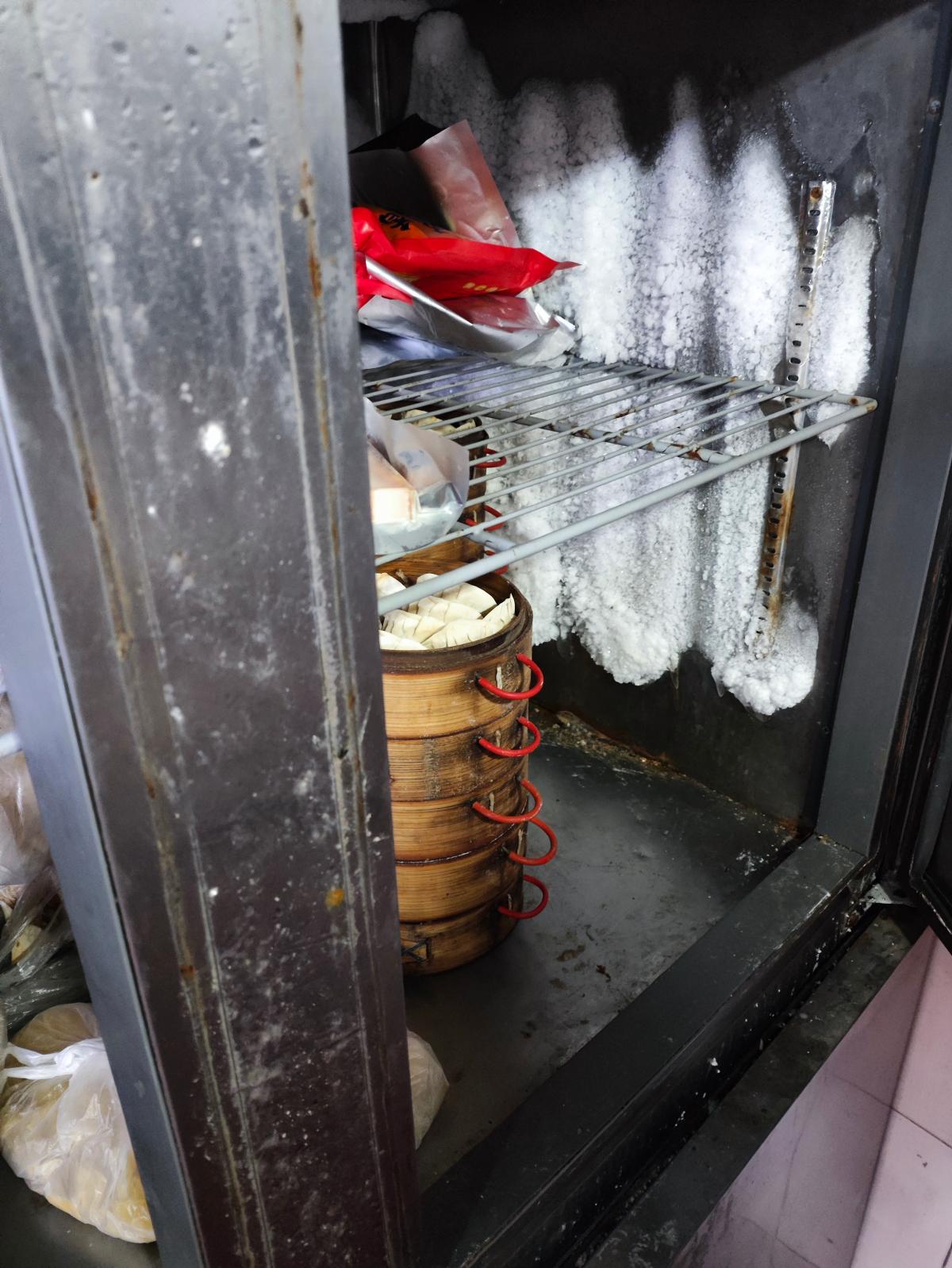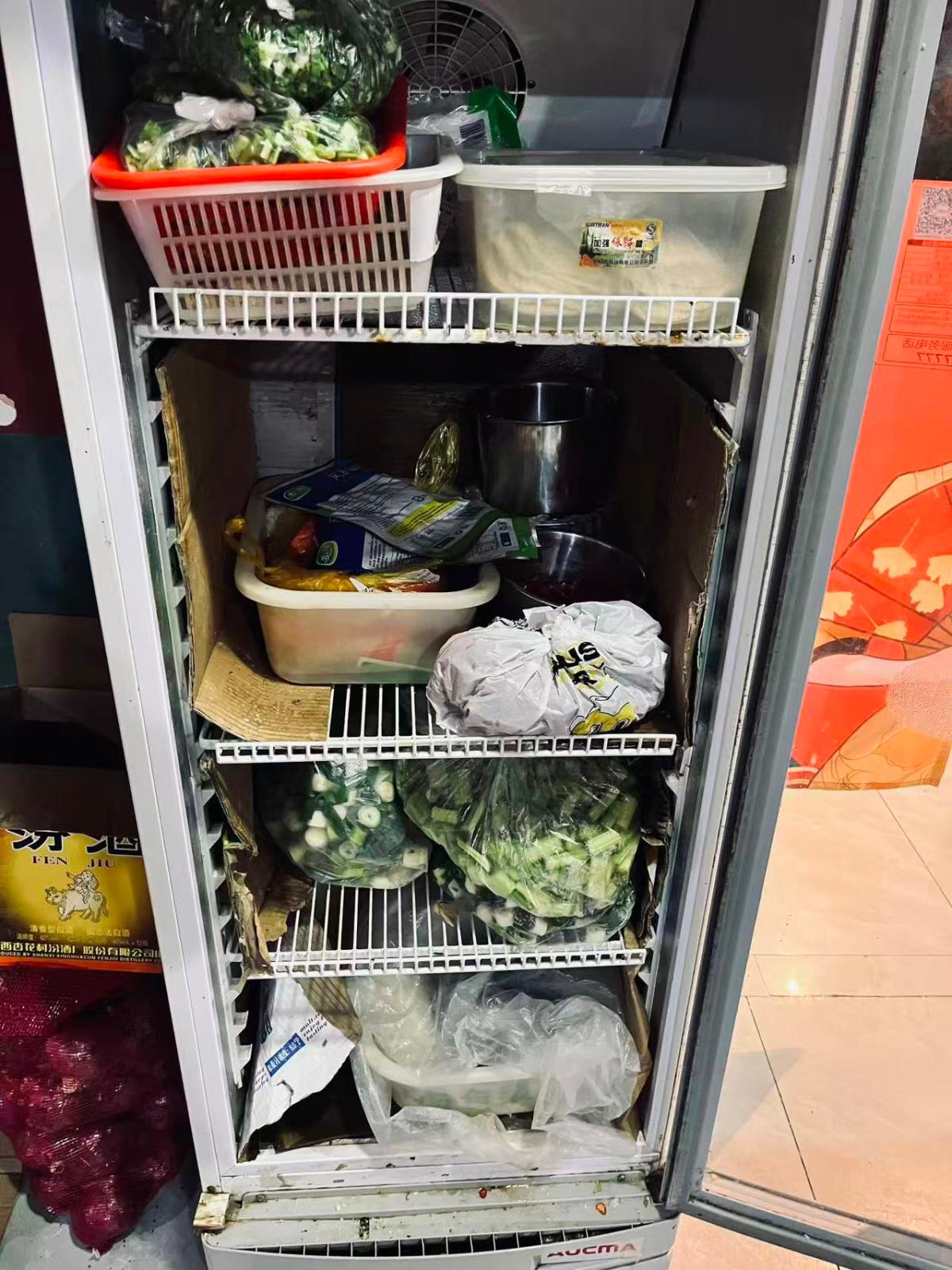 上榜理由:从业人员未规范佩戴口罩、工作帽;操作间冰柜表面和内部污渍重未及时清洗;油烟机油污重未清理。
