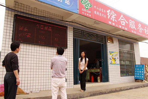 秦楚网讯 特约记者 朱本双 报道:近日,竹山县宝丰镇韩溪河村村民在标准化村级综合服务社电子显示屏前了解“今日商品”价格。据悉,竹山县今年将集中人力物力在全县17个乡镇村级组织办公活动场所,新建100个村级综合服务社。