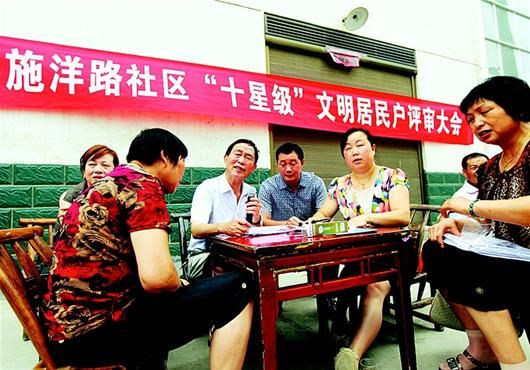 图为:17日,竹山县宝丰镇施洋路社区开展“十星级文明户”评选活动。近年来,竹山县推进“十星级”文明系列评选工作,探索十星级文明户、十星级党员、十星级居民等系列评选工作的新方法、新途径,对“十星级农户”子女在上学、就业、培训、义务工等方面给予优惠,由此形成“户户创十星,人人争十星,家家挂十星”的浓厚氛围。 (本报视界网章磊摄)