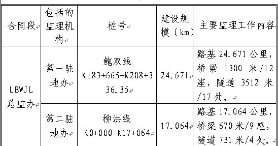 二、本项目工程施工监理设置二级监理机构,即总监理工程师办公室(以下简称“总监办”)和驻地监理工程师办公室(以下简称“驻地办”),承担本项目路基、桥涵、隧道和柳林新集镇洪坪中桥等工程的全部施工监理工作,共划分为1个合同段。本次对LBWJL合同段即公路复建工程监理进行招标,投标人中标后应组建两个驻地办,承担本项目全线工程施工的监理任务,具体的工程监理工作内容见表1-1。