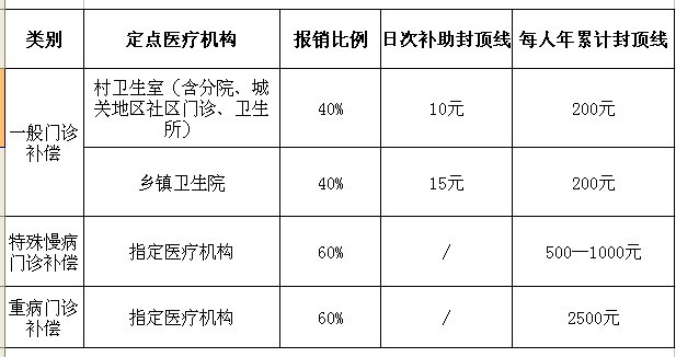 说明:针对不需住院治疗但需长期在门诊就医、费用负担较重的慢性疾病和重病患者,确定了Ⅱ期及以上高血压病、脑卒中康复期、有并发症的糖尿病、风湿性心脏病瓣膜置换术后、重症精神病、系统性红斑狼疮、肺源性心脏病、肝硬化(失代偿期)、甲状腺功能亢进、癫痫、风湿性关节炎中晚期、强直性脊柱炎等12种特殊慢病,尿毒症肾透析、恶性肿瘤放化疗、各类器官移植后用药、白血病、再障性贫血、血友病、冠心病支架术后、脑动脉支架植入术后等8种重病纳入门诊统筹补助。经申报审核的特殊慢病、重病患者可凭合作医疗卡、身份证、合作医疗缴费收据及特殊慢病、重病证到指定定点医疗机构就诊,按上述报销比例获得补偿。