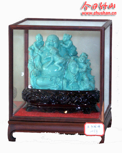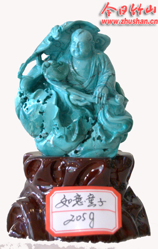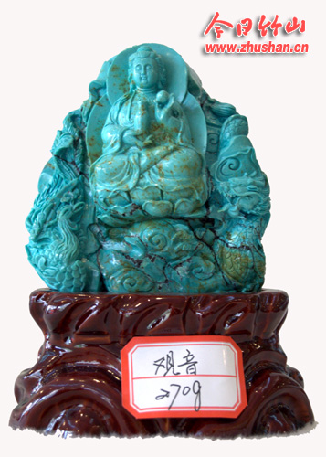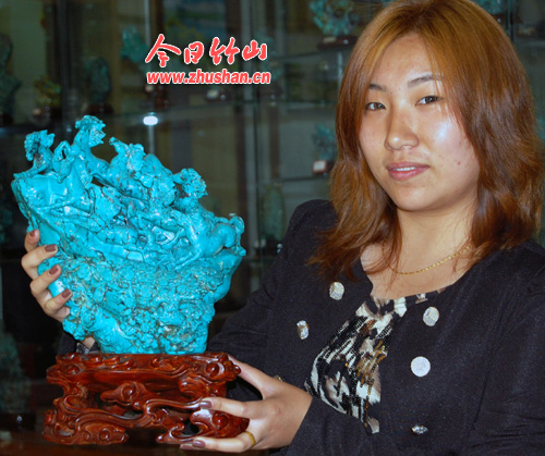 今日竹山网消息 我县致力把绿松石产业培植成支柱产业,走深加工之路,创精品名牌。自2010年2月,“竹山绿松石”获得地理标志产品保护后,特别是《深山淘宝绿松石》、《十星耀竹山》等电视专题片在央视的播放,绿松石雕刻工艺品价格持续上扬,同比翻番,一般达到100多元1克,有的甚至达到200多元1克。图为县绿华珠宝公司新近雕刻的绿松石工艺品。(陈剑 蔡祖波)