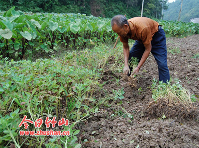 今日竹山网消息 楼台乡今年把花生作为农民增收的主导产业,引导全乡农民扩大种植面积,今年兴建花生基地万亩,虽然在遭遇严重干旱的情况下,仍然取得好收成。图为8月26日,该乡观音沟村农民正采挖花生。 (苗东升)