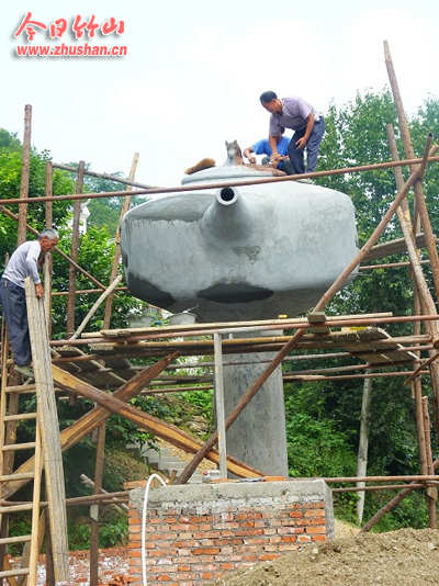 今日竹山网消息 9月5日,笔者在擂鼓镇看到几位建筑工人正在修建小景点。