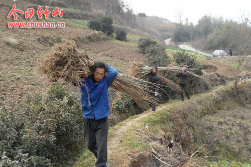 今日竹山网消息 2月25日,宝丰镇漆树扒村梁家沟荒山上,只见10多个农民扛树苗、打树窝、栽树苗,忙得热火朝天。