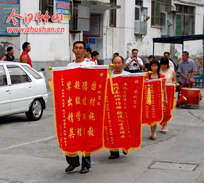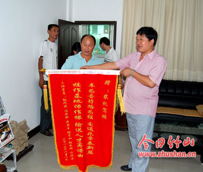 今日竹山网消息 “咚咚锵!咚咚锵……”8月13日一大早,县农机驾驶学校校区响起锣鼓之声,校长冯代意等学校负责人和教练出门一看,原来是该校三班毕业的部分学生带着“因材施教,德技双馨,超级管理,辈出精英”四面锦旗,敲锣打鼓来到学校,将锦旗送到校长冯代意和教练手中。