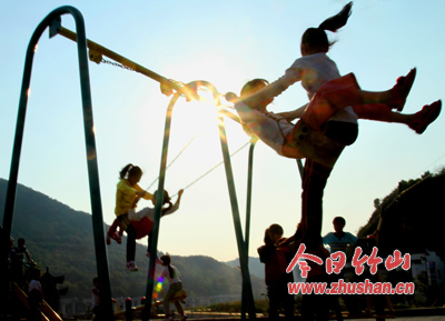 图片说明:1、广场全貌。2、荡秋千的孩子们。3、时尚女孩用手机拍照留影。4、小学生学习十星文化。