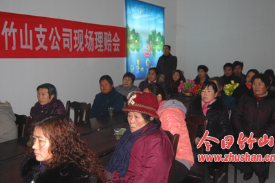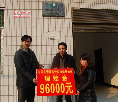 今日竹山网消息 1月7日一大早,县人寿保险公司副经理夏超和宝丰营销部经理陈勇在宝丰营销部门前,将9.6万元被保险人身故保险金交给车祸受害家属黄霞手中,黄霞说,县人寿保险公司真讲信誉,交了200元保险金就赔9.6万元,值得信任。