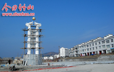今日竹山网消息 元月11日,高达13米的上庸镇新镇标矗立在新建的十星广场上。上庸镇标上为双龙戏珠图案,以显示该镇积淀深厚的龙文化,底座为六面雕塑,表现该镇旅游名镇、魅力新镇、移民大镇等方面特色。(袁斌 陈涛)