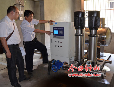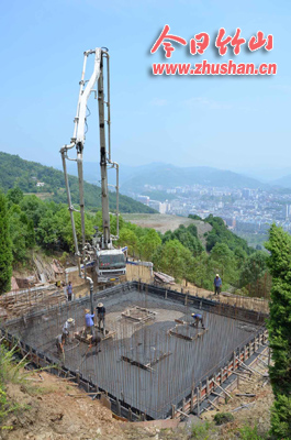 今日竹山网消息 6月17日,在竹山顶上,施工人员头顶烈日浇筑景观式水塔底部混凝土。为解决南门村民、杜家沟和铜皮沟工业园区供水需求,县自来水公司投资180余万元,在竹山顶修建一座亭阁景观式水塔,在南门惠民家园处建泵房,采取无负压二次加压设备,将水加压至水塔,通过专线管道向杜家沟和铜皮沟工业园区供水。(党世根 程涛)