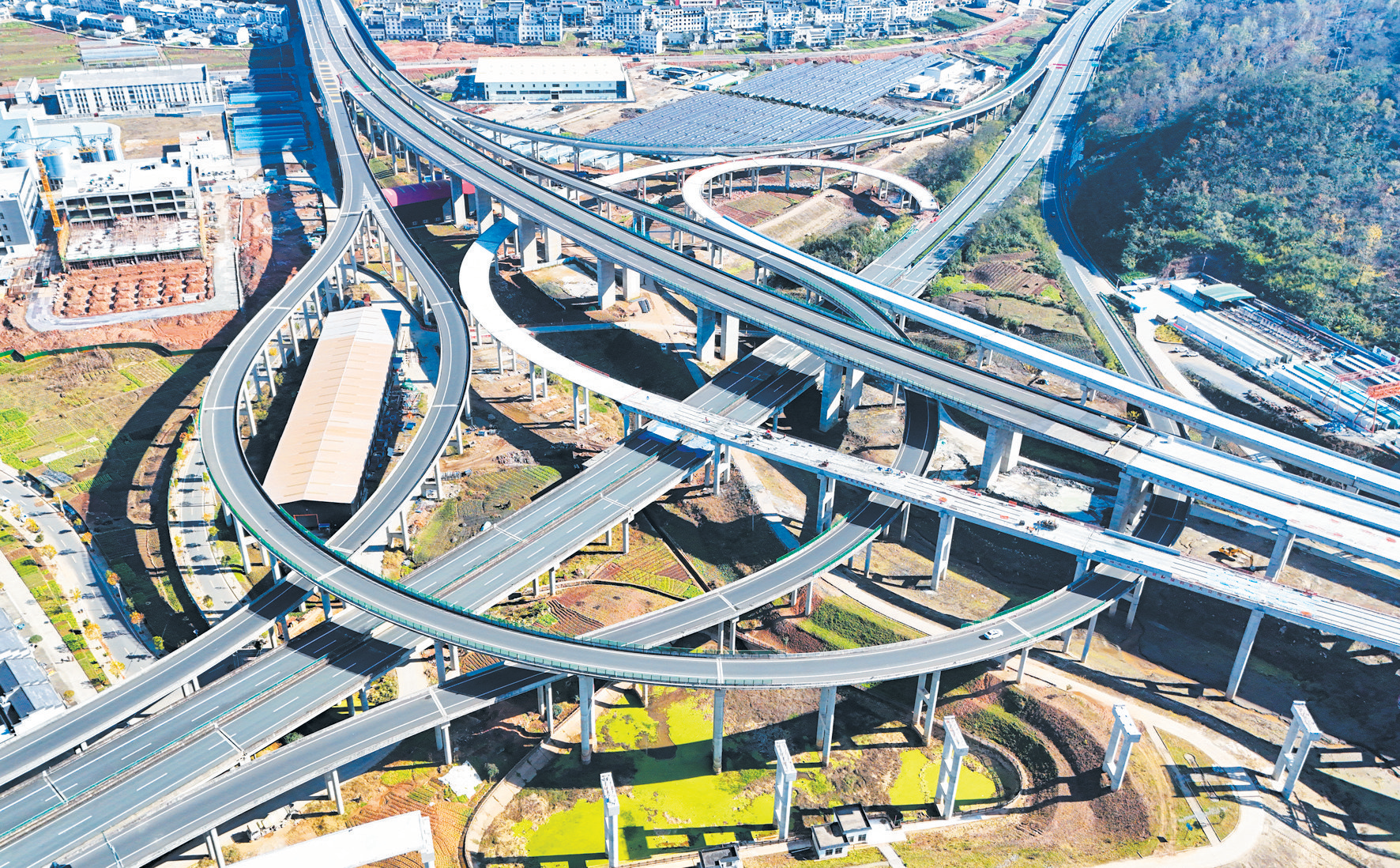 11月22日,记者在竹山县溢水镇十巫南高速公路与谷竹高速公路互通项目建设现场看到,匝道如盘龙叠绕、纵横交错,互通枢纽主体轮廓已清晰展现,气势初显。作为串联鄂陕渝省际通道关键节点,该互通工程桩基施工基本结束,T梁架设进入收官阶段。(张建波 摄)