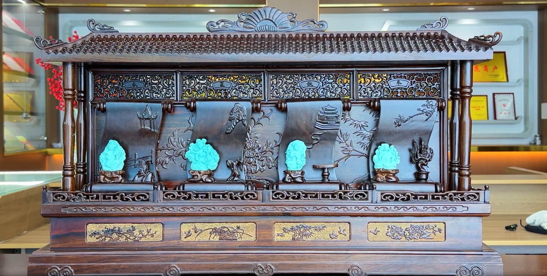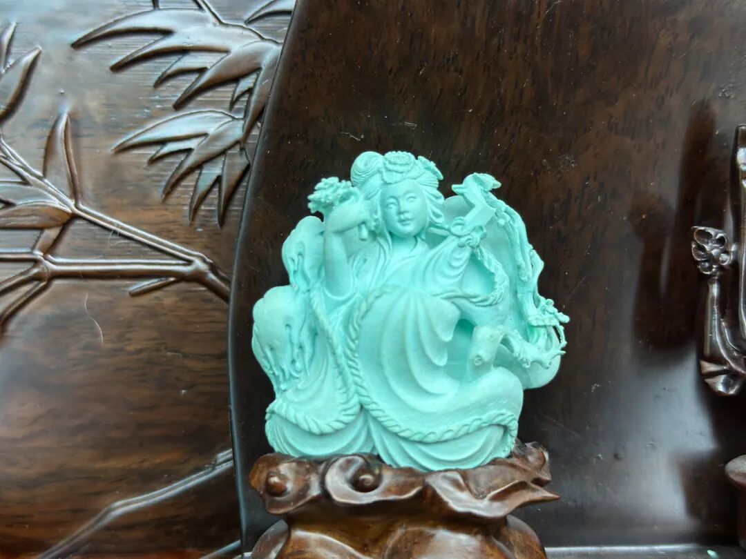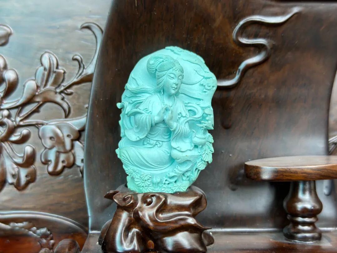 竹山绿松石温润独特,刘志坚巧借石料禀赋,让“四大美人”神韵与松石灵秀相融:西施浣纱线条轻盈,昭君出塞神情坚毅,貂蝉拜月时石纹化朦胧月光,玉环赏花以圆润线条显华贵,梅枝栩栩如生。