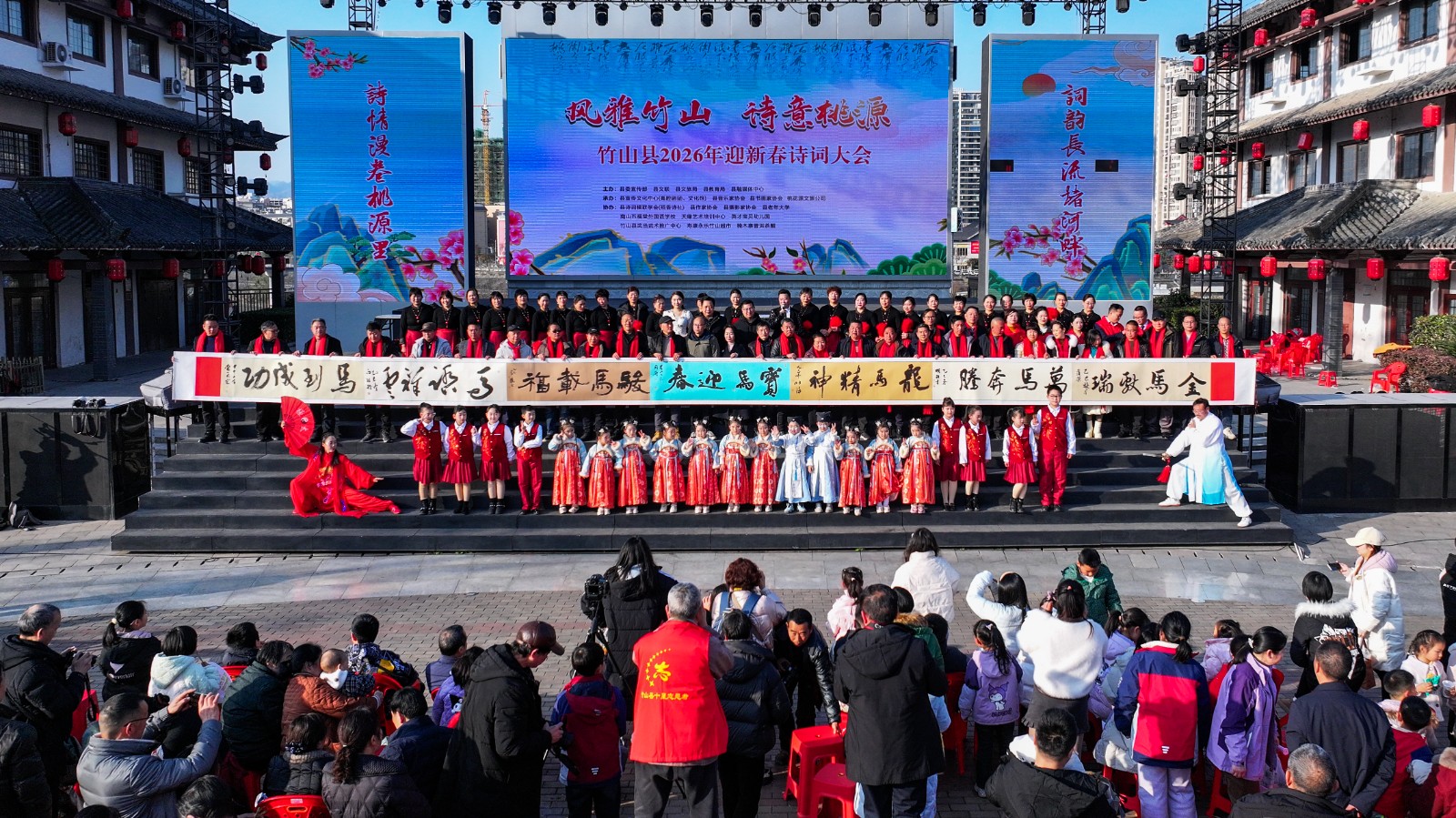 1月24日,我县2026年迎新春诗词大会在桃花源街区女娲广场启幕,同步联动年货节展销活动,以诗词为媒,拉动文旅消费,全方位展示竹山古韵新姿,实现“文化赏心”与“消费暖心”双向赋能。近年来,竹山以文化为媒激发市场活力,先后在女娲广场举办文旅促消费活动80余场次,为优化营商环境、拉动县域经济发展、服务支点建设发挥了重要作用。(章 伟 摄)
